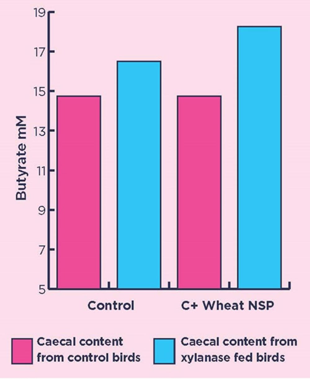 Figure 1: Caecal contents from birds fed diets with or without a a xylanase enzyme (Econase XT) were used as inoculum in a fermentation study to monitor volatile fatty acid (VFA) production. The caecal inoculum from birds pre-exposed to xylanase resulated in an increased butyrate production compared to control birds.