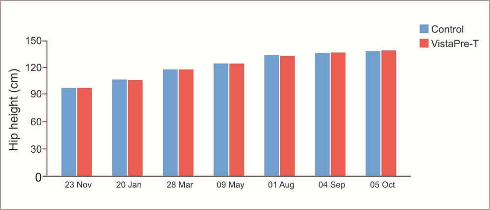 Both LW and hip height were similar throughout the trial (figure 1), with heifers reaching the same overall size by the end of the 45 weeks. However, dry matter intakes for those receiving the improved digestibility ration pre-treated with VistaPre-T were consistently lower (figure 2).