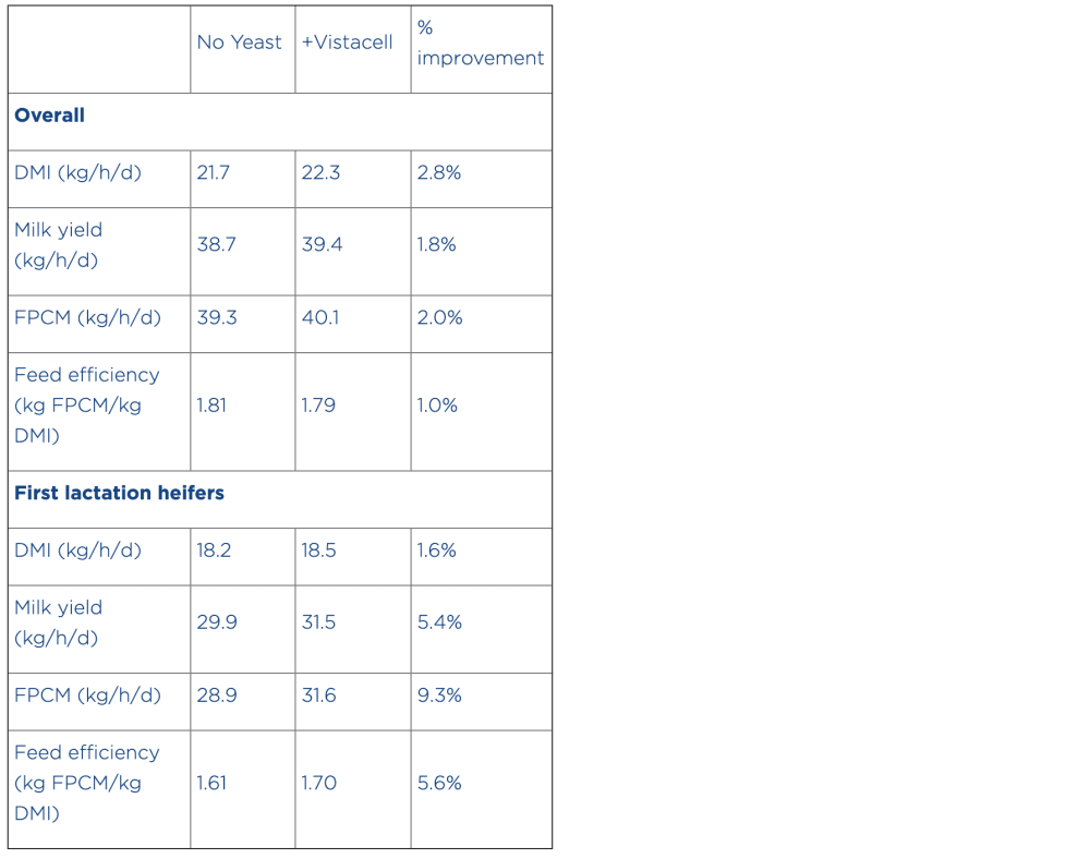 Overall, supplementation with Vistacell led to an improvement (0.7 kg/d) in milk yield and milk components. As a consequence, FPCM also tended to improve (0.8 kg/d) and DMI showed an increase of 0.6 kg/d upon yeast supplementation.