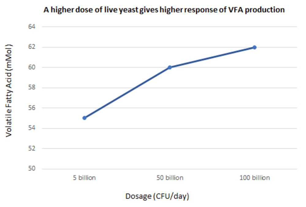 The CFU count per gram of live yeast is, in basic terms, the yeast’s activity level, therefore the higher the CFU count the greater the activity (Figure 1). Higher CFU counts allow live yeasts the greatest opportunity to improve and optimise the rumen environment.