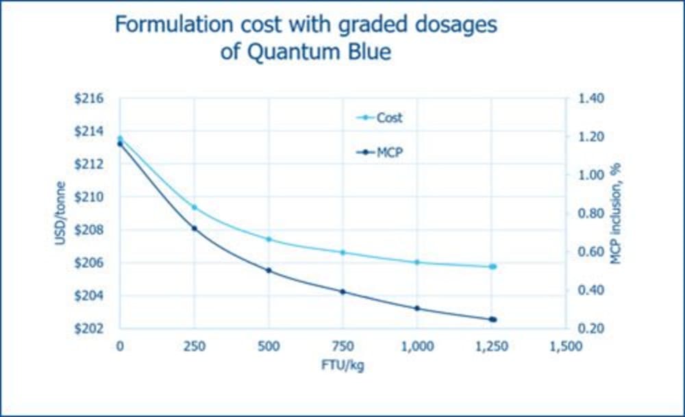 Figure 2: Optimising the P matrix from phytase can lead to reduced cost of feed formulation. Moving from 500FTU to 1000FTU saves $2/tonne proving Quantum Blue is cost effective at higher doses.