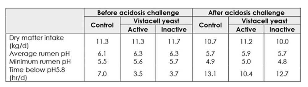 A recent independent trial carried out by Agriculture and Agri-Food Canada (a department of the Canadian government) compared rumen pH fluctuation in beef heifers receiving either 4g/head/day of a metabolically active live yeast (Vistacell), the same dose of yeast deactivated (killed) by autoclaving at high temperature, or no yeast at all. All heifers were fed a non-acidotic mixed ration containing wholecrop cereal silage and a cereal-based concentrate to give an overall 50:50 forage-to-concentrate ratio.