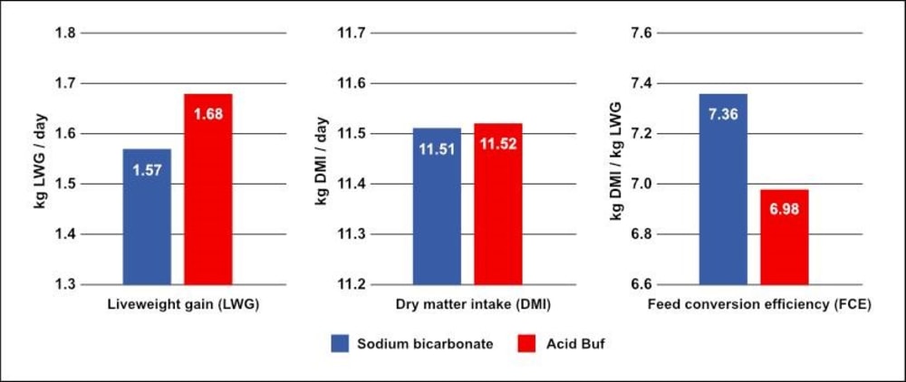 In a University of Milan study involving 126 Charolais bulls, feeding Acid Buf instead of sodium bicarbonate increased growth rate by 7% for no additional feed intake, resulting in a 5% improvement in FCE (figure 1). In addition, the 63 cattle receiving Acid Buf showed clear signs of a reduction in aggressive behaviour, with just two incidences of fighting or mounting observed during a two-hour observation period compared to seven.