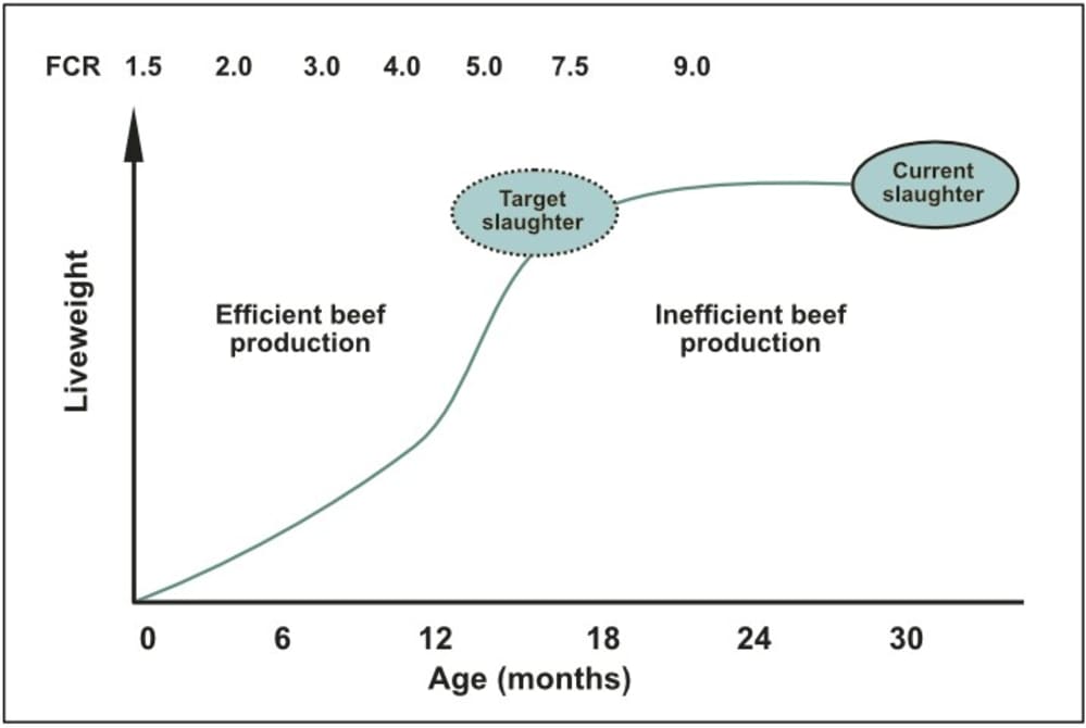 Figure 1 - Impact on efficiency of reduction in feed conversion ratio (FCR) as cattle age