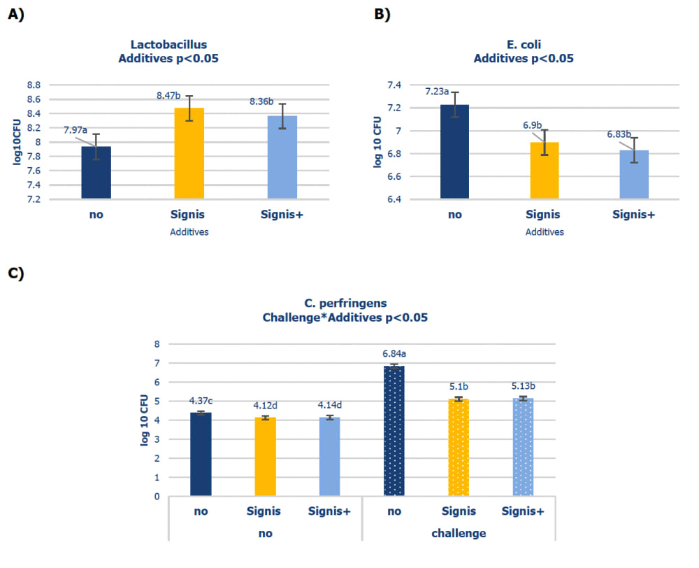 Finally, the trial assessed caecal content for specific bacteria (Figure 2). Birds whose diets were supplemented with Signis or Signis+ showed an increase in the abundance of Lactobacillus bacteria in the caecum and significantly reduced potential pathogenic bacteria (E. coli. and C. Perfringens) to a similar degree (indicating a good moderation of the caecal microbiome).