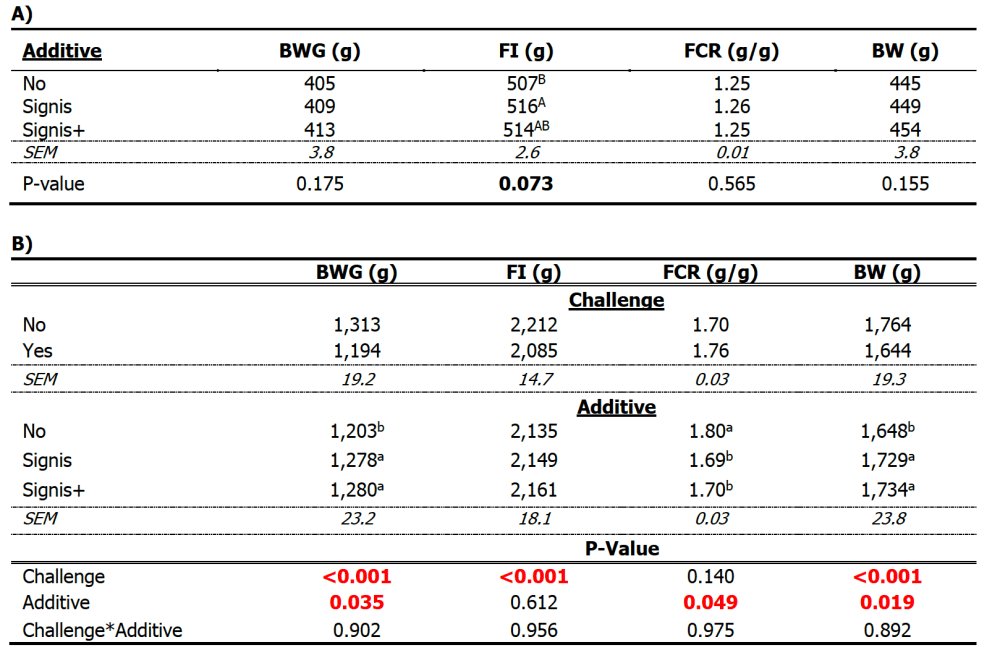 The NE challenge negatively affected the growth performance and gut morphology of the birds, evidenced by a reduction in feed intake (FI), body weight gain (BWG) and feed conversion ratio (FCR). However, the implementation of both additive strategies mitigated this reduction in performance – resulting in increased FI, BWG and FCR – with the results showing no benefit of the inclusion of further additives to the feed (Signis+) than purely Signis alone (Table 1).