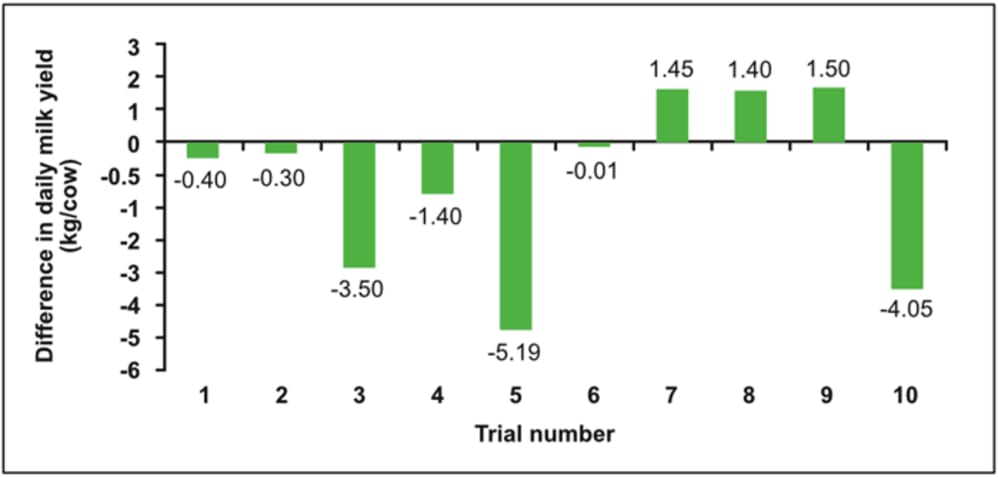 Figure 1 - Differences in milk yield across ten trials comparing controlling energy intake (approx. 80-100% req.) versus over-feeding energy (approx. 140% req.)