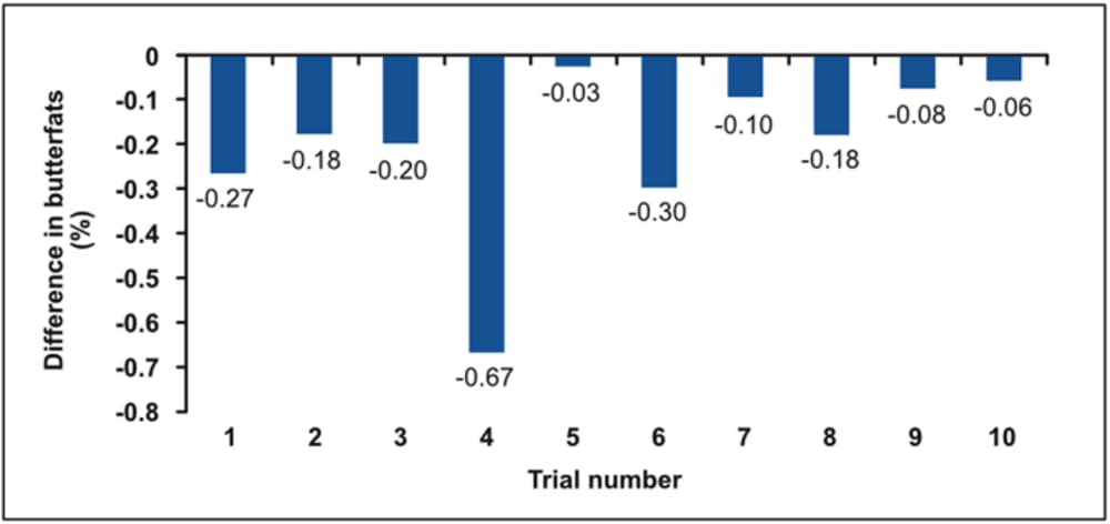 Figure 2 – Differences in butterfats across ten trials comparing controlling energy intake (approx. 80-100% req.) versus over-feeding energy (approx. 140% req.)