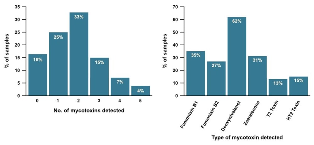 Past mycotoxin testing of maize samples (grain and silage) from across Europe carried out by Micron Bio-Systems has confirmed the scale of the ongoing challenge posed by in-feed mycotoxins. Of the samples tested, 84% contained one or more mycotoxins, 58% contained at least two and 26% were contaminated with three or more mycotoxins (see Figure 1a).